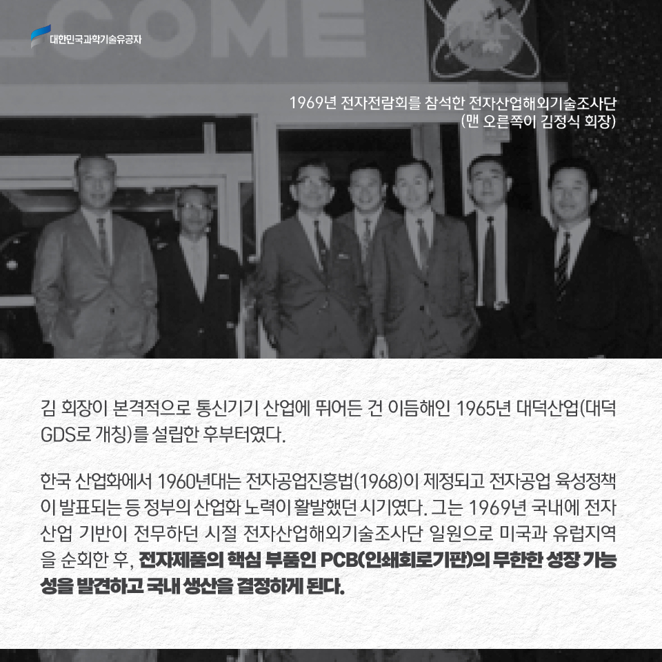 한국 PCB 산업의 역사 일군 전자산업 개척자 작성자 익명 작성일 2020-02-11 조회수 26347 한국 전자제품 기술 향상에 기여 / 기업 이익의 사회 환원으로 노블레스 오블리주 실천 김정식 목록 다음글 ▲ 세계가 인정한 심장 약리학 권위자 한국 약리학 및 기초의학 인프라 구축에 기여 / 우리말 의학용어 보급과 한국 의학의 체계 구축 이우주 이전글 ▼ 2019 대한민국 과학기술유공자 가지 않은 길을 개척하며 대한민국을 일군 12인을 소개합니다.