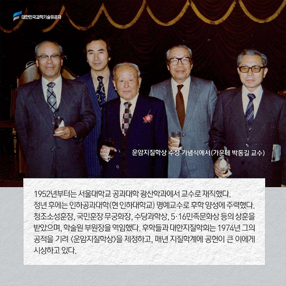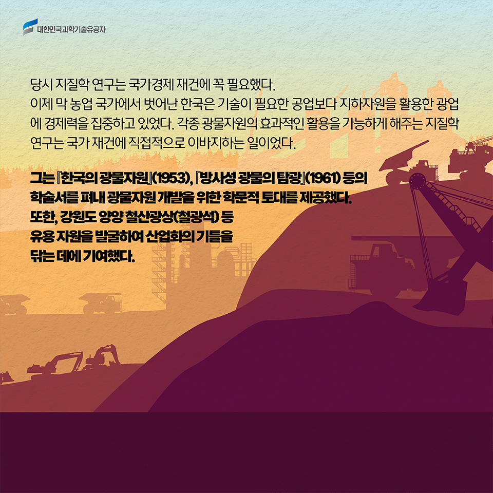 한국 광물자원 연구를 개척한 지질학자 작성자 관리자2 작성일 2020-04-29 조회수 32639 지하자원 연구로 대한민국 산업화에 기여 / 지질학계 후진 양성과 학술공동체 형성 주도 목록 다음글 ▲ KAIST와 포스텍을 연구중심대학으로 발전시킨 화학공학자 세계적 촉매연구로 화학공학의 수준 향상에 기여 / 연구 중심의 대학 학사운영 기틀 마련 이전글 ▼ 한국 우주·해양개발계획 이끈 과학기술 행정가 이어도 종합해양과학기지 건설과 스마트원자로 개발 추진 / 과학기술계 지원과 과학기술인헌장 제정에 기여 故 김정흠 박사 타계 20주기 추모 스토리 지금 우리가 기억해야 할 과학기술유공자 "한국의 과학문화를 대중 속 깊이 뿌리내리게 한 김정흠 박사를 기억해주세요." 故 염영하 박사 타계 30주기 추모 스토리 지금 우리가 기억해야 할 과학기술유공자 "한국 전통 범종의 신비를 입증한 한 명의 과학자, 염영하 박사를 기억해 주세요." 한국 기업의 R&D 역사를 바꾼 바이오산업의 전설 LG화학 연구소를 주도하며 팩티브를 비롯한 신약 개발에 기여 선경을 글로벌 기업으로 이끈 폴리에스터 필름 제조기술 개발 기업 연구소의 성공 모델 제시와 바이오벤처 기업가의 배출 국가의 미래를 설계한 과학기술행정가 의약품·농약 성분 국산화와 정밀화학 산업 기반 구축 물질특허 시대를 대비한 신물질 창출 연구체제 확립 과학기술연합대학원대학교 설립 등 과학기술 진흥정책 주도 세포 신호전달 연구의 세계적 선구자 포스포라이페이스 C(PLC) 아이소자임 발견 등 세포 신호전달 연구의 기틀을 마련 퍼옥시레독신(Prx) 항산화효소 발견 등 산화환원 생물학 분야를 개척 이화여대, 연세대, 기초과학연구원 등 한국 생명과학 기반 강화에 기여 한국 국방연구개발의 기틀을 닦은 연구관리자 번개사업의 성공적 완수로 기본 병기 국산화 달성 장거리 지대지 미사일 백곰 개발 사업 주도 국내 최초의 품질보증제도 구축으로 공업기술의 표준화 및 규격화 기여