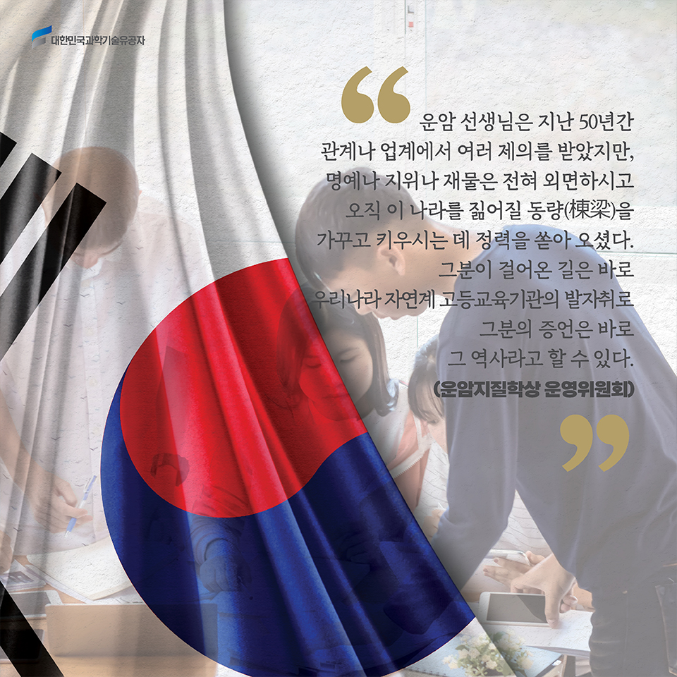 故 김정흠 박사 타계 20주기 추모 스토리 지금 우리가 기억해야 할 과학기술유공자 "한국의 과학문화를 대중 속 깊이 뿌리내리게 한 김정흠 박사를 기억해주세요." 故 염영하 박사 타계 30주기 추모 스토리 지금 우리가 기억해야 할 과학기술유공자 "한국 전통 범종의 신비를 입증한 한 명의 과학자, 염영하 박사를 기억해 주세요." 한국 기업의 R&D 역사를 바꾼 바이오산업의 전설 LG화학 연구소를 주도하며 팩티브를 비롯한 신약 개발에 기여 선경을 글로벌 기업으로 이끈 폴리에스터 필름 제조기술 개발 기업 연구소의 성공 모델 제시와 바이오벤처 기업가의 배출 국가의 미래를 설계한 과학기술행정가 의약품·농약 성분 국산화와 정밀화학 산업 기반 구축 물질특허 시대를 대비한 신물질 창출 연구체제 확립 과학기술연합대학원대학교 설립 등 과학기술 진흥정책 주도 세포 신호전달 연구의 세계적 선구자 포스포라이페이스 C(PLC) 아이소자임 발견 등 세포 신호전달 연구의 기틀을 마련 퍼옥시레독신(Prx) 항산화효소 발견 등 산화환원 생물학 분야를 개척 이화여대, 연세대, 기초과학연구원 등 한국 생명과학 기반 강화에 기여 한국 국방연구개발의 기틀을 닦은 연구관리자 번개사업의 성공적 완수로 기본 병기 국산화 달성 장거리 지대지 미사일 백곰 개발 사업 주도 국내 최초의 품질보증제도 구축으로 공업기술의 표준화 및 규격화 기여