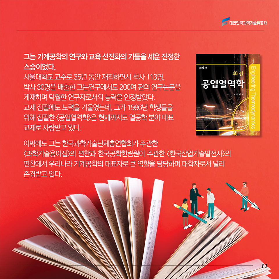 세계 수준의 열공학 연구를 선도하다 작성자 관리자2 작성일 2021-04-26 조회수 22260 열공학 분야에서 세계적 수준의 기술개발 및 인력양성을 선도 에너지산업 및 냉동산업의 발전과 학술활동의 국제화에 기여 목록 다음글 ▲ 한국 기상학과 기상예보의 현대적 기반을 마련하다 고도의 기상예보 기술 확보를 위한 중앙관상대의 기상시스템 현대화 한국기상학회와 <한국기상학회지> 창설로 한국 기상학의 제도화 마련 이전글 ▼ 한국 생명공학 발전의 기반을 구축하다 이성화당 생산공정 개발로 전분당산업 발전 선도 항결핵 항생제 원료의 국산화 성공으로 국민 보건에 기여 故 김정흠 박사 타계 20주기 추모 스토리 지금 우리가 기억해야 할 과학기술유공자 "한국의 과학문화를 대중 속 깊이 뿌리내리게 한 김정흠 박사를 기억해주세요." 故 염영하 박사 타계 30주기 추모 스토리 지금 우리가 기억해야 할 과학기술유공자 "한국 전통 범종의 신비를 입증한 한 명의 과학자, 염영하 박사를 기억해 주세요." 한국 기업의 R&D 역사를 바꾼 바이오산업의 전설 LG화학 연구소를 주도하며 팩티브를 비롯한 신약 개발에 기여 선경을 글로벌 기업으로 이끈 폴리에스터 필름 제조기술 개발 기업 연구소의 성공 모델 제시와 바이오벤처 기업가의 배출 국가의 미래를 설계한 과학기술행정가 의약품·농약 성분 국산화와 정밀화학 산업 기반 구축 물질특허 시대를 대비한 신물질 창출 연구체제 확립 과학기술연합대학원대학교 설립 등 과학기술 진흥정책 주도 세포 신호전달 연구의 세계적 선구자 포스포라이페이스 C(PLC) 아이소자임 발견 등 세포 신호전달 연구의 기틀을 마련 퍼옥시레독신(Prx) 항산화효소 발견 등 산화환원 생물학 분야를 개척 이화여대, 연세대, 기초과학연구원 등 한국 생명과학 기반 강화에 기여 한국 국방연구개발의 기틀을 닦은 연구관리자 번개사업의 성공적 완수로 기본 병기 국산화 달성 장거리 지대지 미사일 백곰 개발 사업 주도 국내 최초의 품질보증제도 구축으로 공업기술의 표준화 및 규격화 기여