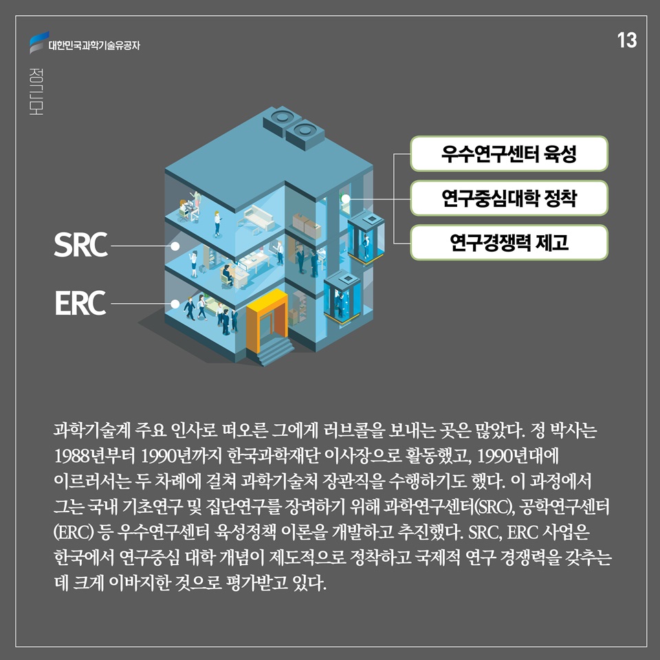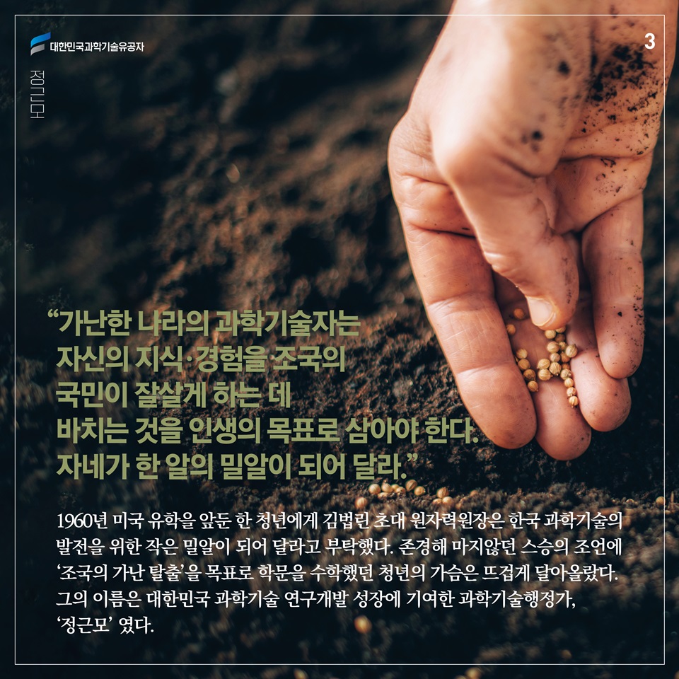 故 김정흠 박사 타계 20주기 추모 스토리 지금 우리가 기억해야 할 과학기술유공자 "한국의 과학문화를 대중 속 깊이 뿌리내리게 한 김정흠 박사를 기억해주세요." 故 염영하 박사 타계 30주기 추모 스토리 지금 우리가 기억해야 할 과학기술유공자 "한국 전통 범종의 신비를 입증한 한 명의 과학자, 염영하 박사를 기억해 주세요." 한국 기업의 R&D 역사를 바꾼 바이오산업의 전설 LG화학 연구소를 주도하며 팩티브를 비롯한 신약 개발에 기여 선경을 글로벌 기업으로 이끈 폴리에스터 필름 제조기술 개발 기업 연구소의 성공 모델 제시와 바이오벤처 기업가의 배출 국가의 미래를 설계한 과학기술행정가 의약품·농약 성분 국산화와 정밀화학 산업 기반 구축 물질특허 시대를 대비한 신물질 창출 연구체제 확립 과학기술연합대학원대학교 설립 등 과학기술 진흥정책 주도 세포 신호전달 연구의 세계적 선구자 포스포라이페이스 C(PLC) 아이소자임 발견 등 세포 신호전달 연구의 기틀을 마련 퍼옥시레독신(Prx) 항산화효소 발견 등 산화환원 생물학 분야를 개척 이화여대, 연세대, 기초과학연구원 등 한국 생명과학 기반 강화에 기여 한국 국방연구개발의 기틀을 닦은 연구관리자 번개사업의 성공적 완수로 기본 병기 국산화 달성 장거리 지대지 미사일 백곰 개발 사업 주도 국내 최초의 품질보증제도 구축으로 공업기술의 표준화 및 규격화 기여